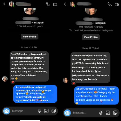 „Szybko, bez stresu i bez mokrej łazienki. Polecam każdemu, kto ma psa, który nie cierpi kąpieli.”